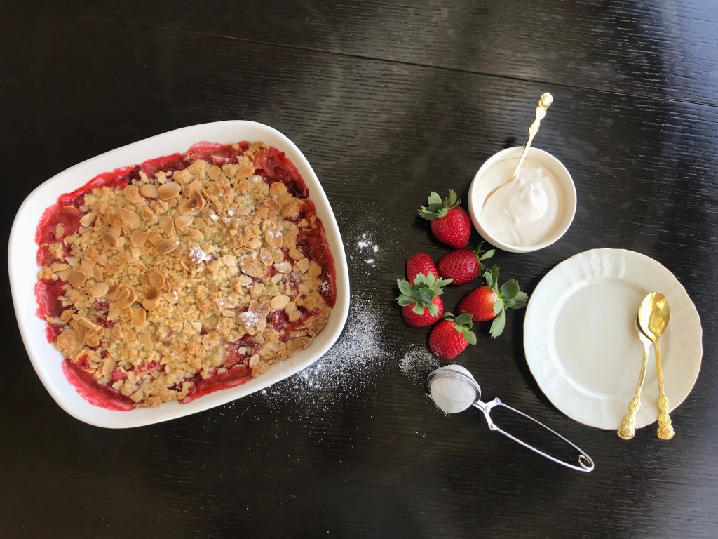 - מעבירים את התותים לקערה ומפזרים מעל את הקראמבל.