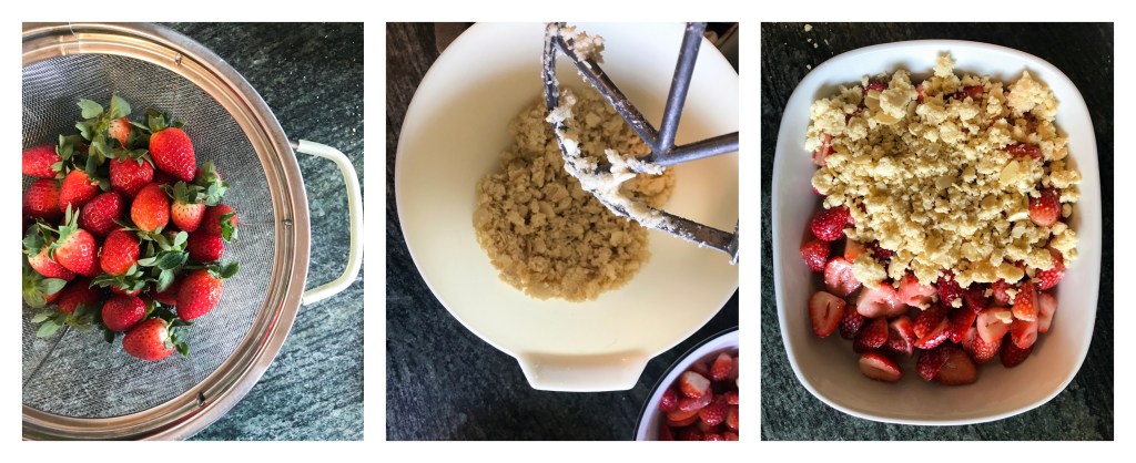 - חותכים תותים לחצי, מפזרים עליהם סוכר וקורנפלור, מערבבים ומשאירים בצד עד שהקראמבל מוכן.