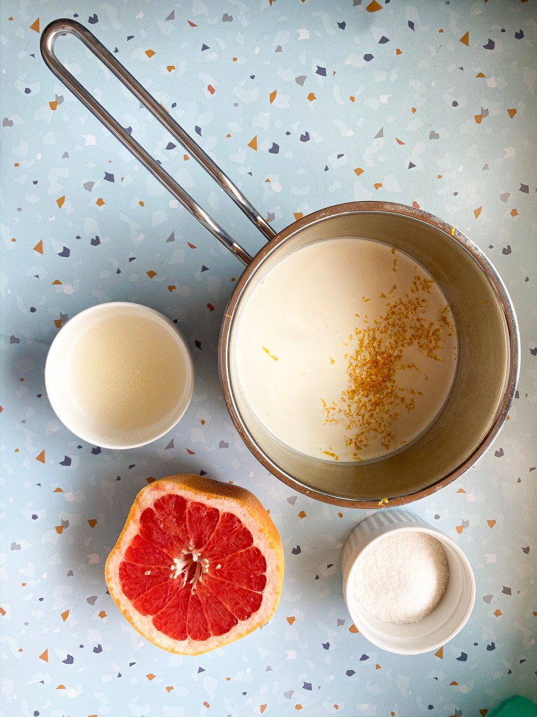 - מחממים בסיר שמנת, סוכר, מיץ וגרידת אשכולית אדומה לסף רתיחה. אני ממליצה לחמם יחסית לאט כדי שגרידת האשכולית תוציא כמה שיותר טעם.