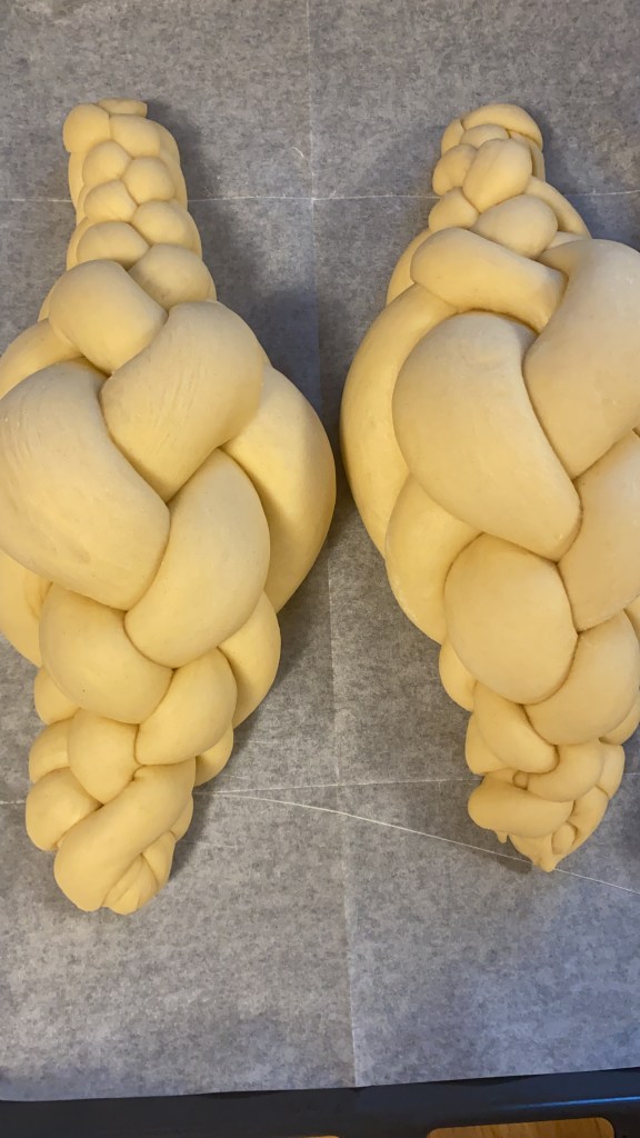 - מעבירים את החלה לתבנית עם נייר אפיה, מכסים ומתפיחים בטמפ׳ החדר עד שכאשר נוגעים בה הבצק ״חוזר״ באיטיות. אצלי זה לוקח כ- 40 דקות בדר״כ.